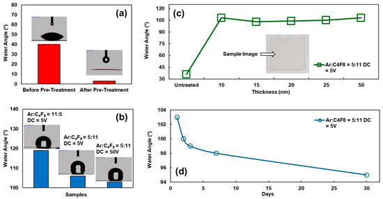 Water contact angles on glass substrates (a) before and after Ar plasma pre-treatment with 16 sccm of Ar gas; (b) after coating with fluorocarbon thin films deposited with different Ar:C4F8 gas ratios and different ion source energies; (c) after coating with fluorocarbon thin films of different thicknesses using an Ar:C4F8 gas ratio of 5:11 at 5 V DC voltage (the insertion is an image of a sample of 25 × 25 mm2); and (d) after coating with a 15 nm thickness thin film using the Ar:C4F8 gas ratio of 5:11 at 5 V DC over 30 days. The RF power was 80 W in all cases.