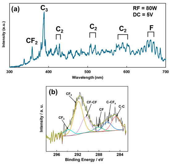 (a) OES of Ar+C4F8 plasma; (b) C 1s XPS of C4F8 plasma-treated surface.