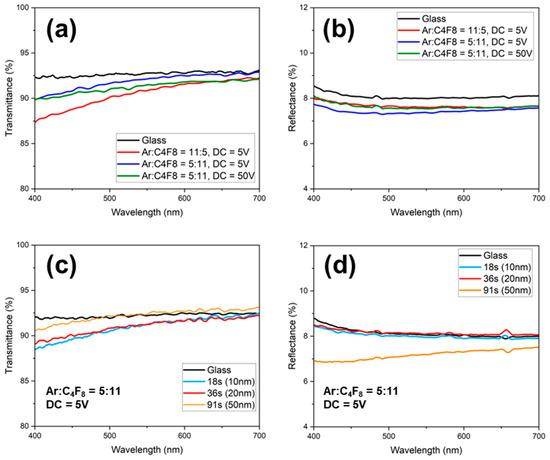 The transmittance and reflectance spectra of the fluorocarbon coatings on glass are shown in Figure 6. In general, the films were highly transparent to visible light. The film transmittance and reflectance in the short wavelength range of <450 nm decreased slightly as the Ar:C4F8 ratio changed from 11:5 to 5:11 (see Figure 6a,b). This was likely due to the enhanced gas ionization and dissociation under a higher Ar concentration, which could create carbon species. The DC voltage had little effect on the film transmittance. As the DC voltage increased from 5 to 50 V, the film transmittance nearly did not change, and the reflectance near 320 nm increased slightly (<1%). This could be caused by ion bombardments, which break C-F bonds and/or create surface defects, as discussed before. Varying the film thickness, the transmittance nearly did not change, while the reflectance decreased slightly (see Figure 6c,d).