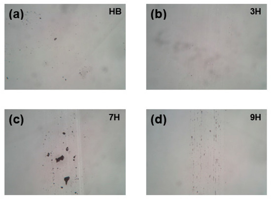 Scratch resistance is an important factor for fluorocarbon film applications, such as display screens and smart windows [20]. Pencil scratch tests were conducted at least five times in different areas on the surface of each fluorocarbon coating of ~15 nm thickness deposited with an Ar:C4F8 gas ratio of 5:11 at 5 V DC voltage. Figure 8 shows the microscopic images of the substrate surface tested with pencils of various hardness of HB, 3H, 7H, and 9H. Even at the maximum hardness of 9H, the thin film still adhered to the substrate without visible delamination. The black spots on the images are debris from the pencil tips, which further indicate strong films and coating adhesion. This is ascribable to the fact that the beam plasma source enables dense fluorocarbon coatings on the glass substrate, which is hard to achieve using conventional deposition techniques.