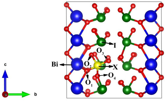 In this study, the crystal structure of BiOIO3 is orthorhombic, exhibiting a space group of Pca21 (No. 29) [11]. This non-centrosymmetric arrangement (NCS) consists of interleaved [Bi2O2]2+ and [IO3]− units. The model of doped BiOIO3, as depicted in Figure 2, demonstrates the utilization of one X atom being substituted for one I atom. Hence, the doping concentration of X-BiOIO3 is precisely 6.25%. The replaced position of atom I must be excluded outside the boundaries in order to mitigate boundary effects. Moreover, within the unit cell, any position of atom I is symmetrical and satisfies the requirements of symmetry. Hence, the replacement position of atom I can be chosen arbitrarily within the unit cell without impacting the final calculation results. In this study, we ultimately selected the coordinate position of replaced atom I as (0.748, 0.366, 0.335). The electronic configurations of the elements discussed in this article are as follows, Bi: 6s2 6p3; I: 5s2 5p5; O: 2s2 2p4; As: 4s2 4p3; Se: 4s2 4p4; Te: 5s2 5p4.