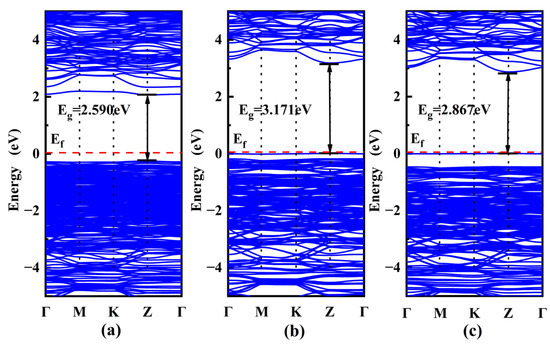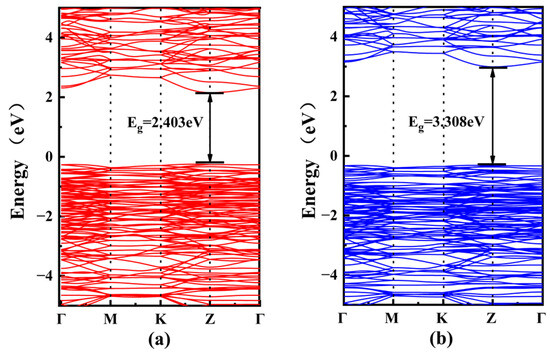To further investigate the variations in electronic structure among different systems, this study computes the energy band and electron state density for each system. The high symmetry points in the Brillouin region of the BiOIO3 cells are denoted by Γ (0, 0, 0), M (0.5, 0, 0), K (0.5, 0.5, 0), Z (0, 0.5, 0), and Γ (0, 0, 0), as shown in Figure 3. The line with zero energy is designated as the Fermi level. The density of states for intrinsic BiOIO3 is presented in Figure 3a,b, calculated using the PBE functional [26] and MBJ functional, respectively. The results indicate that the bandgap value obtained from the PBE calculation is 2.043 eV, which deviates by approximately 38% from the experimental value (3.3 eV) [14]. This underestimation occurs because when solving the Cohen–Shen equation, PBE does not consider the excited states of the system, thereby leading to the underestimation of the band gap. To solve this problem, the kinetic energy density term is added to the MBJ function on the basis of GGA-PBE in order to improve the accuracy of energy and band structure calculations. Therefore, the MBJ potential achieves a significantly higher accuracy in energy and band structure calculations [27]. To enhance the accuracy of the bandgap, we employ the MBJ functional to perform a recalculation of the band structure of materials. The recalculated result of 3.308 eV exhibits a deviation of approximately 0.24% from the experimental value, thereby substantiating its reliability. Consequently, we will employ the MBJ functional approach for subsequent sections to conduct further investigations into the electronic structure.
