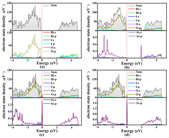 Total electron state density and partial electron state density. (a) Intrinsic BiOIO3; (b) As-BiOIO3; (c) Se-BiOIO3; (d) Te-BiOIO3.