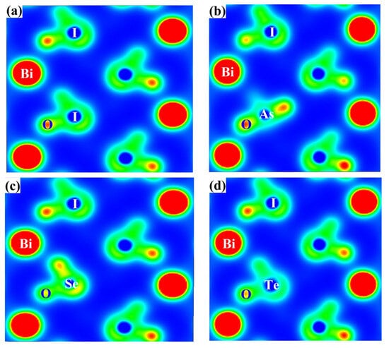 The electron density diagrams on the (100) plane of BiOIO3 before and after doping are presented in Figure 6. It is evident that doping induces alterations in the distribution of electron clouds within the systems, implying a modification in atomic bonding. The introduction of an As atom into BiOIO3 leads to a shift in the bonding between the As and O atoms due to the deviation in atomic positions, resulting in enhanced charge delocalization near the As atoms, as depicted in Figure 6b. Meanwhile, no significant alteration in the electron cloud distribution is observed for the Se-BiOIO3 and Te-BiOIO3 systems, as depicted in Figure 6c,d. However, when compared to intrinsic BiOIO3, the Se atom demonstrates a higher degree of delocalization while enhancing the localization of the adjacent O atom. This suggests a transfer of electrons from the vicinity of the Se atom to the O atom. When one Te atom replaces one I atom, the degree of electron cloud overlap with the neighboring O atoms decreases, indicating a weakening in the bonding interaction between Te and its adjacent O atoms. Consequently, upon the substitution of I atoms by X atoms, the electron cloud undergoes varying degrees of changes, indicating that doping modifies the internal electron arrangement of the system and facilitates electron transfer [22]. The observed phenomenon can potentially be attributed to the disparity in non-metallic properties among the four atoms. In accordance with Pauling electronegativity, iodine (I) exhibits a higher electronegativity value of 2.66 compared to arsenic (As) at 2.18, selenium (Se) at 2.55, and tellurium (Te) at 2.1. Consequently, the non-metallic characteristics of these atoms follow the order I > Se > As > Te. Thus, upon the substitution of iodine atoms with X atoms, there is a reduction in electron cloud density near this position.