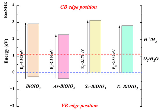 The valence band edge potential of BiOIO3 and X-BiOIO3 at the NHE scale is depicted in Figure 7. The CBM of BiOIO3 and X-BiOIO3 lies above the H+/H2 potential, while the VBM is beneath the O2/H2O potential, suggesting that BiOIO3 and X-BiOIO3 possess the capability of water hydrolysis and oxygen generation. Nevertheless, due to the significant reduction in the bandgap width when Se is doped into BiOIO3, the energy required for electron transition becomes smaller. Hence, it can be inferred that Se-BiOIO3 has a superior water splitting photocatalytic activity among the four systems.