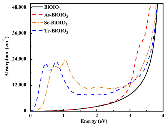 Figure 9b illustrates the calculated imaginary part of the dielectric function before and after doping, revealing significant variations among the three X-BiOIO3 systems within the 0–4 eV range. The imaginary part of the dielectric function represents the energy dissipated due to the induction of a large number of electric dipoles within the system in response to external energy stimulation. This value quantitatively reflects the degree of electronic transition, and its peak corresponds to the strengthened inter-band electronic transition of the system under the action of an external electric field. In addition, this value is also related to the probability of the system absorbing external energy [31]. Notably, Se-BiOIO3 exhibits a small peak at 0.370 eV, reaching a maximum value of 2.5236 eV, attributed to an electron transition between the 4p state of Se and the 2p state of O. At 0.592 eV, a new peak is observed in the Te-BiOIO3 system, attributed to the introduction of impurities that induce orbital hybridization and coupling at this energy level. In conclusion, the peak positions of the Se-BiOIO3 and Te-BiOIO3 systems following doping exhibit a tendency to shift towards the low-energy region. This observation aligns with the conclusions derived from band structure analysis and is also associated with the impurity levels introduced by doping. The doping of Se effectively reduces the bandgap of intrinsic BiOIO3, enhances its light absorption coefficient, and strengthens the polarization electric field within the system. Consequently, it can be inferred that this system exhibits superior optical performance.