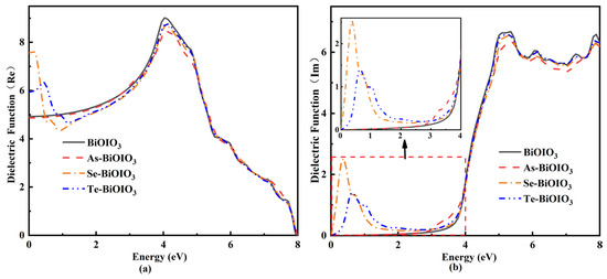 BiOIO3 and X-BiOIO3 dielectric function diagrams: (a) the dielectric real part; (b) the dielectric imaginary part.