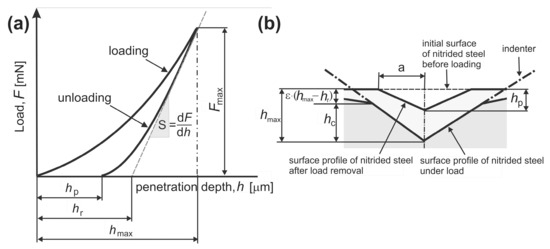 Typical indentation curve (load-displacement curve) (a) and schematic representation of the indenter–sample contact (b); Fmax—maximal load; S—contact stiffness; hp—permanent indentation depth; hr—tangent indentation depth; hmax—maximal indentation depth; hc—contact depth of the indenter with the sample at Fmax; ε—geometric constant (0.75 for Berkovich indenter).