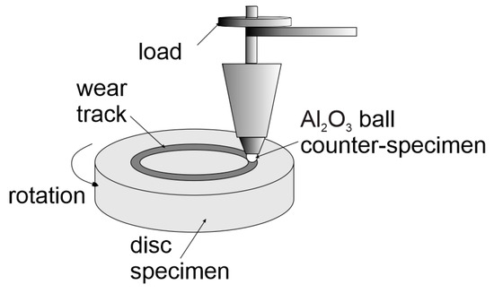 “Pin-on-disc” or “ball-on-disc” devices are one of the most common tribometers in the world, used in testing friction and wear of friction pairs with concentrated contact. In this work, the wear tests were performed using a T-21 tribometer (ITE-PIB Radom, Poznan, Poland) and the “ball-on-disc” technique. The scheme of the wear tests is shown in Figure 2. The gas nitrided specimen, made of 42CrMo4 steel disc, was fixed on a rotating shaft, while the Al2O3 ball was used as a counter-specimen. The load Fn = 4.9 N (0.5 kgf) was applied, and the rotational speed of the disc specimen was equal to n = 120 min−1. Dry sliding tests were carried out in a special chamber with the possibility of heating. During the tests, the temperature was successively raised from an ambient temperature of 23 °C (296 K) to 100 °C (373 K), 200 °C (473 K), 300 °C (573 K), and 400 °C (673 K). The sample was held at each temperature for 30 min. During the test, the chamber temperature, friction force Ff, and displacement of the contact surface between specimen and counter-specimen were recorded. The friction coefficient was calculated according to the equation: