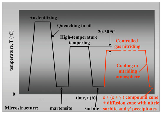 The scheme of the heat treatment (quenching) and thermochemical treatment (gas nitriding) is shown in Figure 3, with the expected microstructure evolution. After quenching in oil, the microstructure of the 42CrMo4 steel was characterized by the presence of martensite. The high-temperature tempering resulted in obtaining the sorbite in microstructure. The microstructure of the gas-nitrided layers was composed of the ε + (ε + γ’) iron nitrides in the compound zone and with nitric sorbite and γ’ precipitates in the diffusion zone. The detailed distribution of nitrogen through the gas-nitrided layer at the nitriding temperature and at ambient temperature after slow cooling was presented in [26].