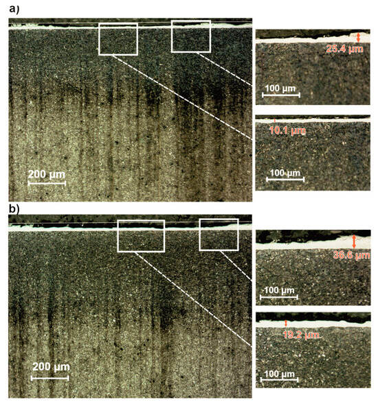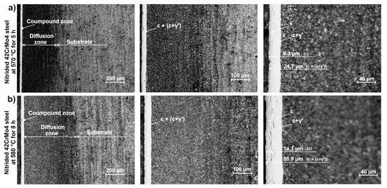Figure 4 shows a cross-sectional microstructure of 42CrMo4 steel after the controlled gas nitriding. Before gas nitriding, the substrate material (42CrMo4 steel) was subjected to quenching and high-temperature tempering, i.e., to toughening. After such a heat treatment, the initial microstructure of the base material (before nitriding) consisted of sorbite (a mixture of ferrite and cementite produced as a consequence of the diffusion transformation of martensite). The gas nitrided layers were composed of a surface compound zone and a diffusion zone located below. The interfaces of both the compound zone/diffusion zone and the diffusion zone/substrate were smooth. In the compound zone, the two areas were visible: the region containing the porous ε (Fe2-3N) iron nitrides and the region composed of the ε + γ’ (Fe2-3N + Fe4N) iron nitrides below the first one. Such a composition in the compound zone resulted from the Fe-N equilibrium diagram as well as the growth kinetics of the nitrided layer; this has been confirmed by many previous studies [1,6,29]. The first process of controlled gas nitriding (carried out at 570 °C for 5 h) resulted in the formation of a thinner compound zone. The average thickness of ε + (ε + γ’) nitrides was about 24.7 μm (Figure 4a). After the second process (at 580 °C for 8 h), the compound zone was significantly thicker, obtaining an average value of 35.9 μm (Figure 4b). Simultaneously, the differences in the thickness of the porous ε zone were visible. The average thickness of this zone was equal to 8.3 μm after the first process and 14.1 μm after the second process. The depth of the diffusion zone was approximately 390 and 580 μm, respectively. This zone was composed of nitric sorbite with precipitates of γ’ nitrides.