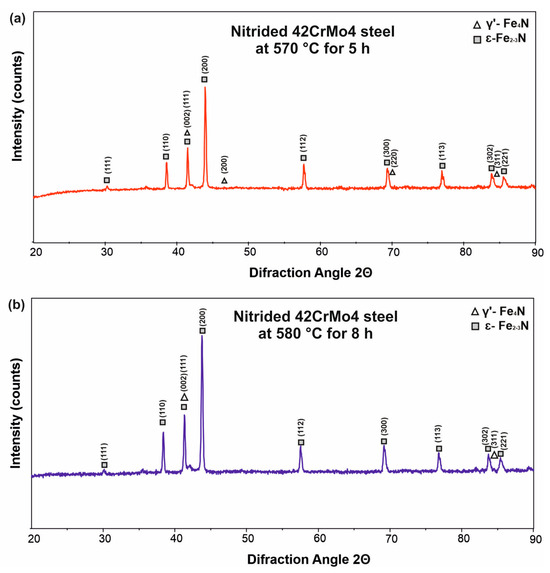 X-ray diffraction patterns of the gas-nitrided layer produced on 42CrMo4 steel: (a) at 570 °C for 5 h and (b) at 580 °C for 8 h.