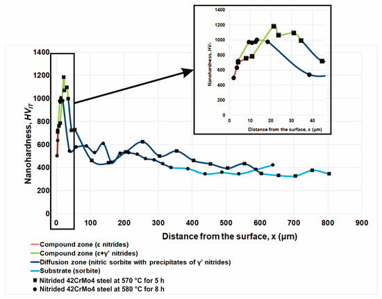 The nanohardness profiles along the cross-section of the gas nitrided specimens were measured vs. the distance from the surface with a nanohardness tester on polished metallographic specimens. These profiles are depicted in Figure 6. The measurements were performed on the etched specimens so that it was easy to identify the zones occurring in the surface layer, as well as the indents in these zones. The Vickers hardness HVIT was calculated based on the measurements of indentation hardness HIT according to Equation (2). The nanohardness differed in the compound zone depending on its phase composition. Lower values of hardness were observed in the porous ε iron nitrides when compared to the ε + γ’ zone. It was characteristic for both nitriding processes that the lowest hardness was measured close to the surface (in the ε zone). The hardness values in the ε zone increased when the distance from the surface increased from 501 to 724 HVIT in the case of the first process (nitriding at 570 °C for 5 h), and from 708 to 785 HVIT in the nitrided layer produced at 580 °C for 8 h. Whereas the ε + γ’ zone was characterized by a significantly higher Vickers hardness HVIT. The measured values ranged in this zone of the layer from 975 to 1005 HVIT and from 996 to 1183 HVIT for the processes carried out at 570 °C for 5 h and at 580°C for 8 h, respectively. Next, below the compound zone, hardness gradually diminished in the diffusion zone from 609 HVIT below the iron nitrides to 390 HVIT at the end of this zone and from 720.3 to 346.5 HVIT, respectively, in the case of the nitriding processes at 570 °C for 5 h, and at 580 °C for 8 h, respectively. The averaging Vickers hardness of the substrate with sorbite microstructure was 374 and 345 HVIT, respectively. Quite large hardness fluctuations in the diffusion zone and slightly smaller ones in the substrate were caused by the relatively low load used during measurements (50 mN). This resulted in small indents that could hit different phases in the diffusion zones (nitric sorbite or γ’ precipitates) differing significantly in hardness. The ranges of hardness values measured in all the zones of nitrided layers in relation to the depth of specific zones are shown in Table 2.