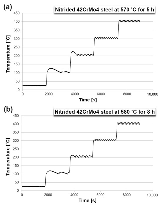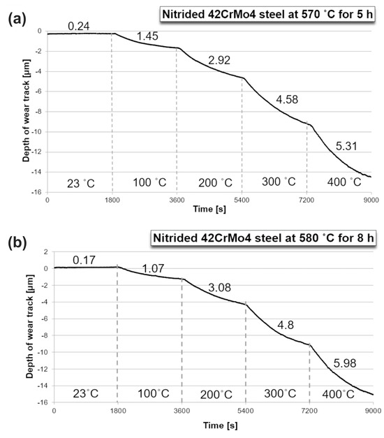 The temperature during the wear test was recorded and changed every 30 min from room temperature (23 °C) to 400 °C. The results of the temperature measurements are shown in Figure 7 for nitrided layers produced both at 570 °C for 5 h (Figure 7a) and at 580 °C for 8 h (Figure 7b). In the initial stage of heating, the working chamber and temperature fluctuations were visible. The largest temperature fluctuations were observed at a nominal temperature of 100 °C. Wear tests conducted at a nominal temperature of 200 °C were characterized by slightly smaller fluctuations, and at 300 and 400 °C the temperature was already well stabilized.
