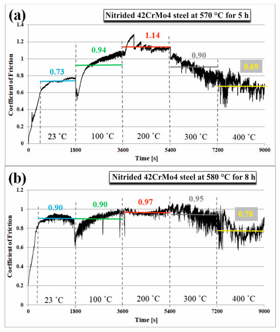 Friction coefficients vs. time of friction at elevated temperatures for the gas nitrided layer produced: (a) at 570 °C for 5 h and (b) at 580 °C for 8 h.