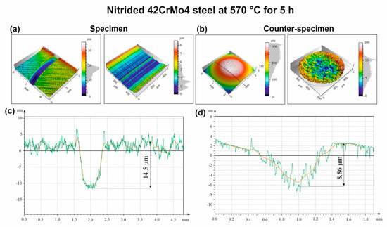 Figure 11 shows the surface topography of the worn nitrided layer produced at 580 °C for 8 h mating it with the counter-specimen. A 3D surface view of nitrided specimen and counter-specimen is visible in Figure 10a,b, respectively. A 2D surface profile (Figure 11c,d) made it possible to determine the depth of the wear tracks, which were 15.1 μm and 11.2 μm for the sample and counter-sample, respectively. Such a depth of the wear track in the nitrided specimen was only slightly lower than that (17.4 μm) determined based on the OM image (Figure 9b).