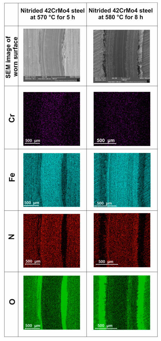 SEM images of worn surfaces of the gas nitrided layers and EDS patterns of elements characteristic of the gas-nitrided specimens (Fe, N, Cr) and oxygen after the high-temperature wear test with the change in the temperature every 30 min with a final temperature of 400 °C.