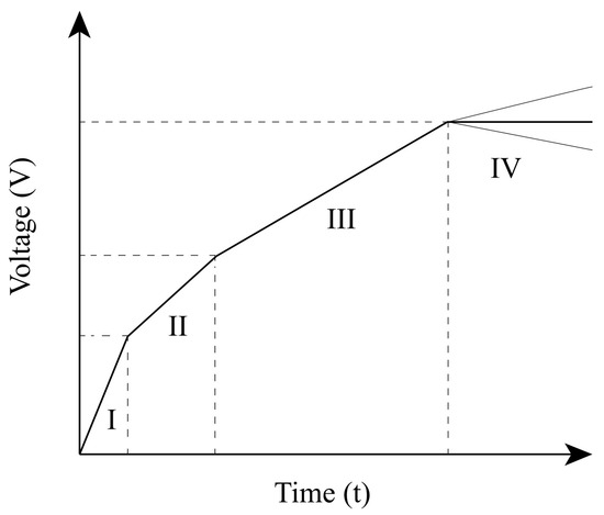A schematic diagram of voltage variation over time during the PEO process: I—anodizing stage, II—spark discharges stage, III—micro-arc discharges stage, IV—arc discharges stage [18].