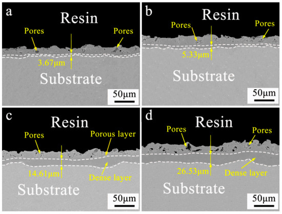 Cross-sectional morphology of PEO ceramic layer under soft spark discharge treatment at different times: (a) 1160 s; (b) 1200 s; (c) 1800 s; (d) 2400 s [33].