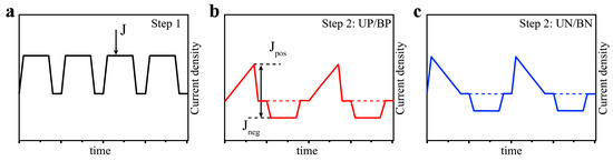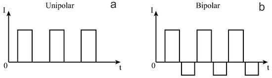 The pulsed current type is either unipolar or bipolar. In unipolar signals, a single polarity current is used, i.e., a pulsed direct current which switches between on and zero states without changing polarity, as shown in Figure 4a. Unipolar pulses are the optimum choice for stimulating controlled microdischarges in the oxidizing process [8,12]. The application of bipolar signals makes the achievement of a more uniform distribution of microdischarges easier, thus enhancing coating quality. The bipolar signals change the polarity of the current during the PEO process due to the fact that the current flows in both directions (Figure 4b), leading to more intricate interactions on the electrode surface. This would also mean that the current changes with each cycle, with anodic and cathodic effects on the material surface. One of the major advantages of bipolar signals is a reduction in thermal stress, and hence flaws and cracks in the oxide covering. Bipolar pulse signals are capable of producing the so-called ‘soft spark’ mode, which helps in controlling energy and the intensity of microdischarges. An important feature of this process is the charge ratio between the positive and negative half-cycles, which directly influences the growth dynamics of the oxide layer and, in general, the properties of the coating [14,76].