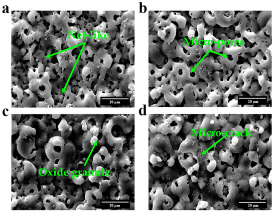 Coatings produced under unipolar conditions typically exhibit a net-like surface structure (Figure 5a). This morphology is characterized by the presence of uniformly distributed pores that are primarily circular in shape, varying in size, but maintain a regular and organized appearance. The uniformity of the pore distribution is attributed to the steady discharge dynamics facilitated by unipolar waveforms, which generate consistent electrical conditions during the PEO process.
