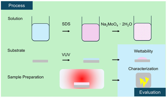 The following supporting information can be downloaded at: https://www.mdpi.com/article/10.3390/coatings15010004/s1, Figure S1: Original static contact angles photos in Figure 3: (a) on substrates without vacuum ultraviolet (VUV) treatment, (b) on substrates with VUV treatment, and (c) on VUV-treated substrates with SDS/Na2MoO4·2H2O solution.