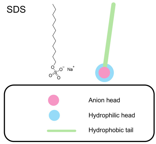 Molecular structure of SDS and illustration of its hydrophobic tail and hydrophilic anionic head group.