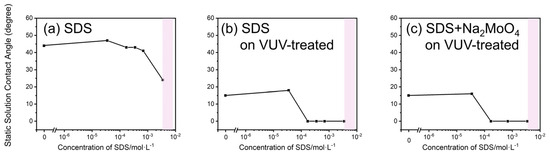 Figure 3 shows the static contact angles of aqueous SDS solutions under three conditions: (a) on substrates without VUV treatment, (b) on substrates with VUV treatment, and (c) on VUV-treated substrates with SDS/Na2MoO4·2H2O solution. The original static contact angles photos can be found in Figure S1. In addition, the contact angle obtained here can be ignored because the surface roughness of the silicon wafer used in this experiment is in the nanometer range. The pink band shown in Figure 3 represents the critical micelle concentration (CMC) of SDS in the solution [45,46]. The CMC refers to the concentration at which surfactant molecules begin to aggregate and form micelles in the solution. As shown in Figure 3a, the static contact angle decreased from about 45° to 30° with the increase in SDS concentration, indicating improved wettability caused by the addition of SDS, although the wettability was not significantly high.