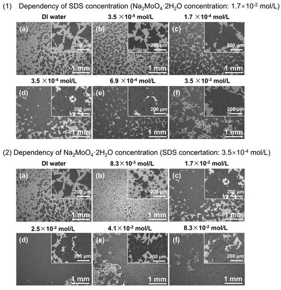 SEM images of MoS2 crystals at (1) a fixed Na2MoO4·2H2O concentration of 1.7 × 10−2 mol/L and varying SDS concentrations (DI water, 3.5 × 10−5, 1.7 × 10−4, 3.5 × 10−4, 6.9 × 10−4, and 3.5 × 10−3 mol/L from (a–f)), as well as at (2) a fixed SDS concentration of 3.5 × 10−4 mol/L and varying Na2MoO4·2H2O concentrations (DI water, 8.3 × 10−3, 1.7 × 10−2, 2.5 × 10−2, 4.1 × 10−2, and 8.3 × 10−2 mol/L from (a–f)).