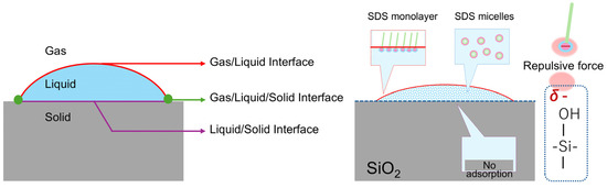 At low SDS concentrations, an SDS monolayer is formed at the air–liquid interface, which reduces the static contact angle. At high SDS concentrations, micelles are formed in the solution, thereby reducing the static contact angle and surface tension. Micellar formation at concentrations below the typical CMC is likely due to electrostatic repulsion between the anionic silanol groups on the surface and the anionic SDS head groups [48,49,50,51,52]. Micellar formation in a solution is energetically more favorable than surface adsorption. Next, the effect of adding Na2MoO4·2H2O as the MoS2 precursor on wettability was investigated. The results indicated that wettability was primarily determined by the SDS concentration, regardless of the presence of Na2MoO4·2H2O. Therefore, SDS micelles facilitate the uniform distribution of MoO42− ions throughout the solution, leading to homogeneous growth over the entire surface. The micelles, with their hydrophilic heads, encapsulate and transport the MoO42− ions, allowing them to be evenly dispersed in the solution and uniformly delivered to the substrate. If this hypothesis is correct, then the crystal growth of MoS2 would be more uniform and two dimensional at SDS concentrations above the CMC.
