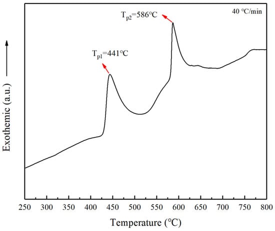 Figure 1 presents the DSC curve of Fe83Si6B6P1.5C1.5Cu1Nb1 as-quenched ribbon. The curves show two strong exothermic peaks at 441 °C and 586 °C, indicating the existence of two crystallization stages during the annealing process. Two stages of crystallization are shown by the two exothermic peaks (Tp1 and Tp2), namely, the exotherm of crystallization induced by the mixed precipitation of α-Fe(Si) and α-Fe(Si) + Fe3(B, P) + Fe2B [24,25]. The widening of the range of ∆Tp (∆Tp = Tp2 − Tp1) between the two exothermic peaks favors the growth of the α-Fe(Si) phase in the form of nanocrystals without inducing B-compound precipitation, indicating that the amorphous alloy has good thermal stability [26].