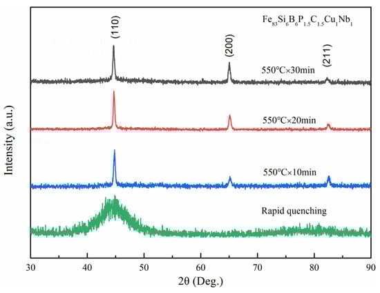 Figure 2 presents the XRD curves of Fe83Si6B6P1.5C1.5Cu1Nb1 ribbons in the as-quenched and after annealing at different times. A noticeable diffuse scattering peak at 2θ = 45° is present in the as-quenched ribbons, implying a high degree of amorphous phase. After retreating at 550 °C for 10 min, an obvious α-Fe(Si) phase diffraction peak appeared, indicating that at this time, the amorphous formation ability of Fe83Si6B6P1.5C1.5Cu1Nb1 ribbons decreased, and the transition from amorphous to crystalline phase was made [28]. The XRD diffraction peaks and their full width at half maxima (FWHM) gradually slowed down and became larger as the crystallization annealing was elevated from 10 to 30 min, indicating a gradual decrease in α-Fe(Si) grain size. Jiang et al. demonstrated that fine and uniform nanocrystalline phases improve soft magnetic properties effectively when studying Fe81.5Si0.5B4.5P11Cu0.5C2 alloy [29]. Table 1 presents the average grain size after different annealing times. The calculated average grain size declined smoothly from 60.1 nm to 58.9 nm when the crystallization annealing time was increased from 10 min to 20 min at the annealing temperature of 550 °C. When the crystallization annealing time was 30 min, the average grain size decreased significantly to 53.7 nm. The solid solution and diffusion of solute elements during the annealing process can promote uniform grain refinement and reduce grain size.