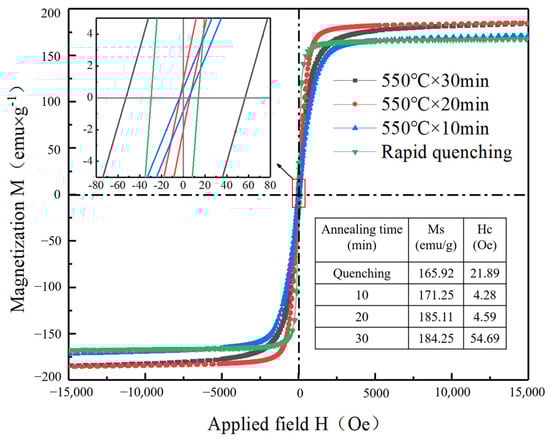 Figure 3 presents the VSM curves of Fe83Si6B6P1.5C1.5Cu1Nb1 ribbons annealed at different times. When the crystalline annealing temperature was 550 °C, the soft magnetic properties were enhanced as the time increased from 10 min to 20 min, and the saturation magnetization strength increased significantly from 171.25 emu/g to 185.11 emu/g, with a slight increase in coercivity. When the annealing time was 30 min, the soft magnetic properties of the alloy strip decreased, the hard magnetic properties increased, and the saturation magnetization strength decreased slightly, but the coercivity increased rapidly by a factor of 11.