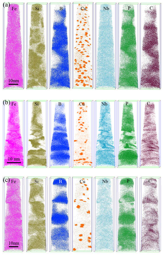 The microstructure of Fe83Si6B6P1.5C1.5Cu1Nb1 ribbons influences the soft magnetic properties such as the initial permeability and coercivity of the ribbons, which are closely related to the migration of the atomic migration and elemental segregation. Figure 4 presents the 3D distribution of each element in Fe83Si6B6P1.5C1.5Cu1Nb1 ribbons annealed at 550 °C at different times. As can be seen in Figure 4a, significant bias aggregation of Si atoms occurs to form α-Fe(Si) grains. Cu atoms undergo significant bias aggregation to form high-density Cu clusters due to low solid solubility, and these Cu clusters stimulate the nucleation of α-Fe nanocrystalline grains by lowering the activation energy of α-Fe nanocrystalline grains [30]. There is a small increase in the concentration of Nb atoms at the α-Fe(Si) grain boundaries, but because the annealing time at this point is relatively short, the Nb atoms are still more uniformly distributed in the matrix, and no significant segregation occurs. In addition, B, P, and C proto also underwent significant bias polymerization. When the crystallization annealing time was extended to 20 min, the alloying element polarization in the strip is more significant, and the B, P, and C atoms diffuse from the interior of the α-Fe(Si) phase into the matrix. This is consistent with the conclusion that B and P are excluded from α-Fe(Si) grains and enriched in the amorphous matrix during annealing as suggested by Jafari et al. [28]. The volume fraction of the α-Fe(Si) phase in the matrix increases, the soft magnetic properties of the ribbons are enhanced, and the enhancement of the stability of the amorphous matrix is due to the enrichment of B, P, and C atoms in the amorphous matrix between the α-Fe(Si) phases. When the crystallization annealing time is further extended to 30 min, (as shown in Figure 4), the B, P, and C atoms continue to be biased toward the matrix between the α-Fe(Si) phases, alongside the stability of the α-Fe(Si) phases, Fe3B is generated in the B-rich region, which deteriorates the ribbon’s soft magnetic characteristics.