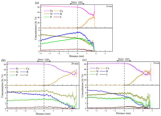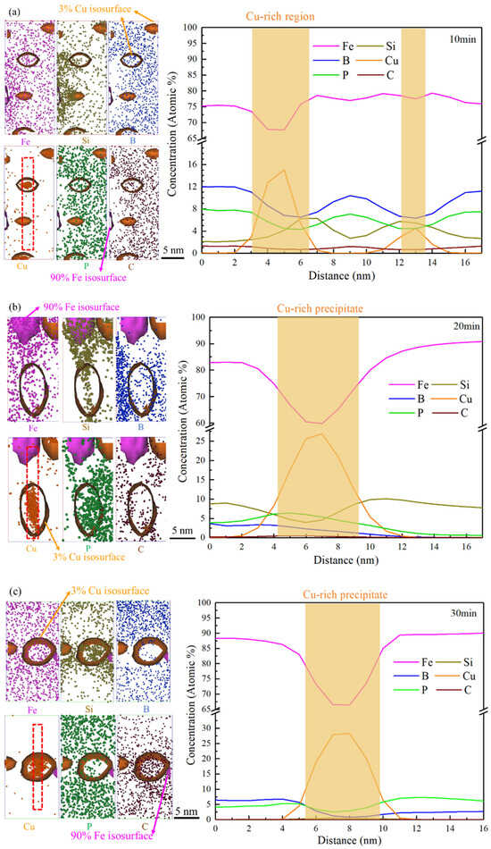 In order to further investigate the relationship between the distribution of alloying elements and soft magnetic properties at different annealing times, the profiles of elemental distribution around the 3% Cu isosurface and 90% Fe isosurface are shown in Figure 7. As can be obtained from Figure 7a, the B and P atoms tend to form B-rich and P-rich regions in the amorphous matrix when the annealing time is 10 min, and the Si atoms are biased to form α-Fe(Si) grains on the outside of the Cu-rich clusters. As shown in Figure 7b, when the crystallization annealing time is extended to 20 min, the increase in the percentage of 90% Fe isosurface indicates an increase in the content of α-Fe(Si) grains, and combined with XRD, it can be seen that at this time the grain size of the α-Fe(Si) phase decreases, which indicates that a large number of small-sized α-Fe(Si) grains have been generated in the matrix. The size of the 3% Cu isosurface increases to form a Cu-rich phase, and at the interface of the Cu-rich phase, B-rich and α-Fe(Si) phases are formed, and the P atoms are polarized toward the boundary of the B-rich phase. Due to the Ostwald ripening mechanism (ORM), the small-sized Cu clusters are gradually dissolved, and the Cu atoms migrate to the large-sized clusters to increase their size [33,34]. The improved homogeneity of Cu clusters helps to promote the uniform nucleation of α-Fe(Si), resulting in the formation of higher percentage but finer α-Fe(Si) grains. When the annealing time is 30 min, the dimensions of 3% Cu isosurface and 90% Fe isosurface are decreasing as shown in Figure 7c. As the size of the Cu-rich clusters decreases, the ability to promote crystallization is weakened, and some α-Fe(Si) grains may start to dissolve or stop growing. Meanwhile, due to the large solubility difference between the B-rich phase and the α-Fe(Si) grains, it is difficult to form a complete crystal structure in the transition region, and thus a local amorphous structure may be formed, which effectively inhibits the rapid growth of nanocrystalline grains [35,36].