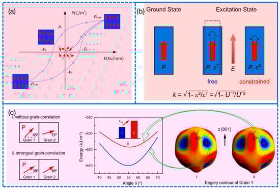Figure 1. (a) Typical hysteresis loop of ferroelectric materials. (b) Definition of electromechanical coupling factor, k. Reprinted with permission from Ref. [54] Copyright 2022, Nature Communications. (c) Illustration of the grain correlation effect on the permittivity based on the Landau theory: grain−correlation will make the polarization rotation path deviate from its equilibrium point and hence flattens the energy profile, which increases the permittivity εT and eventually enhances k33. Reprinted with permission from Ref. [54] Copyright 2022, Nature Communications. - (3)