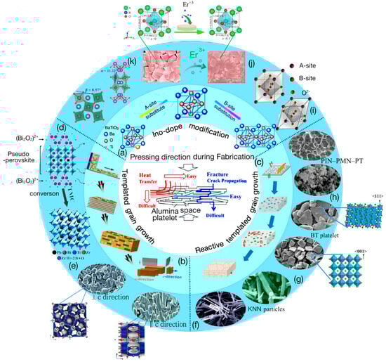 The enhanced piezoelectricity should be attributed to several combined effects, mainly including the R-O-T phase boundary that promotes polarization rotation, crystal orientation-induced intrinsic piezoelectric anisotropy, electric field-induced lattice distortion, and phase transition [55]. The strain output of randomly oriented ceramics can be suppressed due to limited polarization reversal induced by grain confinement [56]. Strongly anisotropic ferroelectric single crystals have a much higher piezoelectric response compared to polycrystals, and the texturing technique is a technique that is used to control the orientation and alignment of grains in ceramic materials, which essentially takes advantage of the anisotropy of piezoelectric properties [57]. The process comparison of the texturing technique with ion doping modification and group element optimization techniques is shown in Figure 2. In contrast to both, woven ceramics tend to exhibit single-crystal-like properties in the direction of grain orientation growth, which provides an opportunity to achieve superior strain output [56]. The optimal grain orientation is achieved by tuning the preparation parameters to allow such materials to grow optimally along the crystallographic direction with greater piezoelectric properties [40,58,59]. Compared with unoriented polycrystalline materials, after texturing, the highly optimal grains enhance the piezoelectric coefficient, d33, by a factor of 1.4 to 2.1 [44]. The following methods are used to prepare textured ceramic materials: thermal processing [60,61], template grain growth (TGG) [62,63,64], reactive template grain growth (RTGG) [47,48,65], and electroscopes and strong magnetic field-assisted method [66], oriented curing (OCAP) technique [67], and Rolling-assisted Biaxially Textured Substrates [68]. Figure 2 illustrates the main process flows of these techniques, and in this paper, we will focus on the template grain growth (TGG) and reactive template grain growth (RTGG) methods.