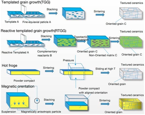 As shown in Figure 3, heat treatment texturing techniques include hot pressing, hot forging, and hot rolling [70], which are used to achieve texturing by applying an external force under high-temperature conditions to produce dislocation motion and grain boundary slip, etc., within the grains, which results in the directional arrangement of the grains [60]. Template grain growth (TGG) is a method that involves guiding the growth of other crystals through the use of a stationary crystal template [71]. This usually involves preparing a template crystal with the desired crystal structure, contacting the template crystal with a suitable solution or melt so that substances in the solution are deposited on the surface of the template crystal, controlling the growth conditions of the deposits (e.g., temperature, pressure, etc.) so that new crystals are formed on top of the template crystal, and, ultimately, removing the template crystal, leaving behind a new template-based crystal [36,69]. Reactive template growth (RTGG) is a method that utilizes a chemical reaction process to generate new crystals in a template. The steps of the method are as follows: prepare an appropriate template, e.g., porous material, nanoparticles, etc. Place the template in a suitable reactant solution or gas phase. When the chemical reaction occurs, the reactant reacts with the template to generate new crystals. Reaction conditions, such as temperature, concentration, and reaction time, are regulated to control the growth process of the new crystals. The reaction template growth method can be used to synthesize a wide variety of crystalline materials and can be used to control the shape, size, and structure of the crystals by adjusting the reaction conditions. The advantage of this method is that the structure, shape, and orientation of the new crystals can be controlled by the choice of template crystals. Therefore, it is widely used in materials science to synthesize materials with specific crystal structures, such as nanomaterials and polycrystalline materials [72,73].