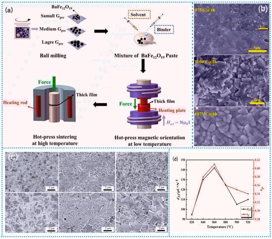 - Dong, A.; Liu, R.; Tian, Z.; Peng, F.; Zhao, R.; Su, X.; Tang, R. Effect of pre-sintering particle size on the microstructure and magnetic properties of two-step hot-press prepared BaFe12O19 thick films. J. Alloy. Compd. 2023, 967, 171683. [Google Scholar] [CrossRef]