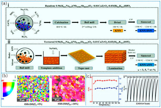 (a) Schematic illustration of synthesis procedures used to develop (i) random and (ii) textured KNN−xNN piezoceramics. Reprinted with permission from Ref. [87], Copyright 2023, ACS. (b) EBSD micrographs of (i) random ceramic, KNN−0NN. (ii) textured, KNN−5NN ceramic. Schematic illustration of synthesis procedures used to develop (i) random and (ii) textured KNN−xNN piezoceramics. Reprinted with permission from Ref. [87], Copyright 2023, ACS. (c) Unipolar strain curves (i) and ST/SRT (ii) of KNNS−BxBAZ (x = 0.2) textured ceramics as a function of temperature. Reprinted with permission from Ref. [85] Copyright 2023, Journal of Materiomics.