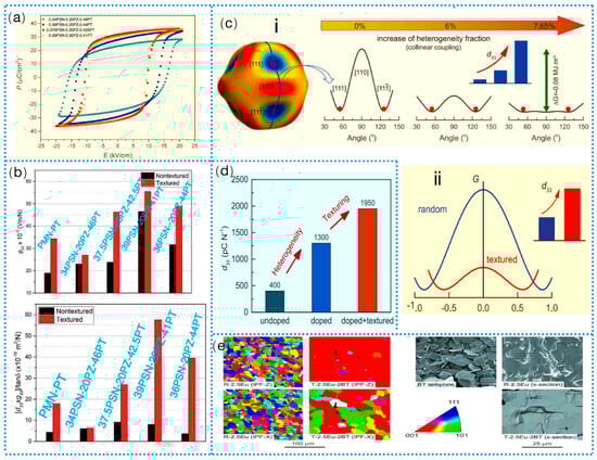 The piezoelectric properties of Pb-based ceramics can be improved by two methods, namely the formation of metamorphic phase boundaries (MPBs) and the doping of rare earth elements [96,97,98,99]. Moriana et al. [100] developed chalcogenide Pb(Sc1/2Nb1/2)O3-PbZrO3-PbTiO3(PSN-PZ-PT) systems with different compositions using the TGG method, and the ferroelectric properties are shown in Figure 7a. Comparing the degree of texturing of the templates with different contents reveals that the PT content is positively correlated with the degree of texturing, which is due to the suppression of TGG due to, for example, the higher melting points of Sc2O3 and ZrO2. As shown in Figure 7b, PSN-PZ-PT has a high Curie temperature and polarization stability while maintaining comparable piezoelectric properties to binary Pb(Mg1/3Nb2/3)O3-PbTiO3 (PMN-PT); achieving synergistic effects using the two mechanisms in the same material has been difficult because the microstructural design is affected by the compositionally induced local structural inhomogeneities. As shown in Figure 7c, Yan [101] et al. successfully addressed this challenge for the first time by proposing a synergistic design of local structural heterogeneity and grain texturing under image-only modeling and phase-field simulation, where local structural heterogeneity is introduced by doping rare earth elements (including relaxation ferroelectrics), and the d33 of the PMN-PTs is enhanced with the increase in the volume fraction of heterogeneity [101], and then PMN-PT piezoelectric ceramics are prepared using the TGG process. Figure 7d,e show that the Eu3+-doped woven PMN-PT piezoelectric ceramics are highly [001] oriented compared to the others. Li et al. [102] found that Eu3+ doping has a great influence on the morphology of the domains and the size of the domains of the PMN-0.25PT ceramics due to the fact that a high Eu3+ doping level helps to enhance the local structural inhomogeneity, disrupting the long-range ordered ferroelectric states and producing more disordered and smaller domain microstructures [102,103,104]. However, PMN-PT and PZN-PT single crystals show very low phase transition temperatures and low Curie temperatures (Tc~130–170 °C), resulting in poor temperature stability and a relatively low mechanical quality factor (Qm), both of which limit their applications [105].