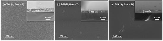 Figure 1 gives the surface morphologies and cross-section images of three sets of TaN films obtained using SEM characterization. From the surface morphology in Figure 1a, it can be seen that there are a very large number of crystal grains on the TaN film surface when there is no N2 introduced during sputtering, and the boundaries between the crystal grain boundaries are relatively obvious. These crystal grains are of different sizes, with dimensions on the order of tens of nanometers. For this sample, the thickness of the film is observed to be about 176 nm through the subfigure in Figure 1a, and the film deposition rate is known to be about 1.47 nm/min based on the deposition time of 120 min. In addition, crystal grain boundaries are again evident on the fracture surface of the film, as is also evident through the inset in Figure 1a. With the passage of N2 during the sputtering process, as shown in Figure 1b, when the N2 flow rate is 7 sccm, only a few crystal grains of slightly larger sizes can be observed at the observed magnification, and no obvious crystal grain boundaries can be seen in other regions. A closer look reveals that only small grains with very little color differentiation can be seen, which are on the order of a few nanometers. The subfigure in Figure 1b shows that the film thickness is about 168 nm, and the film deposition rate is 1.40 nm/min. The surface and cross-section of the TaN film obtained by sputtering with a N2 flow rate of 14 sccm are shown in Figure 1c. As can be seen from Figure 1c, almost no crystal grain boundaries can be observed on the surface of the film under this deposition condition, and the surface appears to be very smooth, which is corroborated by the characterization results of the cross section in the subfigure in Figure 1c. Besides, the subfigure in Figure 1c shows that the thickness of the film is about 151 nm, and the film deposition rate is about 1.26 nm/min. From the cross-section characterization results, namely, the subfigures in Figure 1a–c, we know the thicknesses of the three groups of TaN films are 176 nm, 168 nm, and 151 nm, which indicates that the sputtering rate decreases slightly with the increase in the partial pressure of N2 in the sputtering chamber, due to the decrease in the partial pressure of the working gas, Ar, and the concentration of ionized Ar+ decreases.