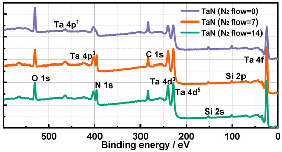 The XPS test results of the three TaN films are presented in Figure 2. In the test spectra, the characteristic peak of Ta 4f corresponds to a binding energy of 24.75 eV, and the characteristic peak of N 1s corresponds to a binding energy of 395.14 eV. In fact, after XPS fine spectroscopy analysis, it is clear that the characteristic peak of Ta 4f is a double peak, with a 23.67 eV binding energy corresponding to Ta 4f7 and a 25.54 eV binding energy corresponding to Ta 4f5. The spectral analysis results show that the elemental N in the formed films is significantly increased with the increase in the N2 gas flow in the experiment; the corresponding film contents of elemental N in the films at a N2 gas flow of 0 sccm, 7 sccm and 14 sccm are 5.92%, 15.87% and 19.27% and the content of elemental Ta is 16.89% 20.41% and 18.19%, respectively. This result shows that the elemental content of N and Ta in the film gradually increases with increasing N2 gas flow. In addition, the test results include a C 1s peak at 283.80 eV and an O 1s peak at 530.16 eV, indicating the presence of gas adsorption via CO2, water vapor and organic contamination on the sample surface.