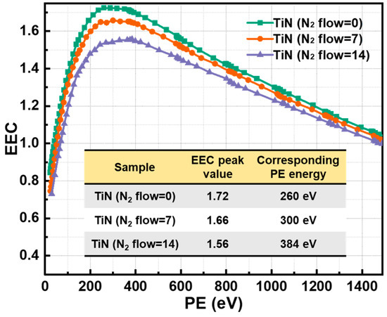 Figure 6 presents the measured EEC data for the TiN films with increasing N2 gas flow, as well as the statistical results of the feature parameters of the EEC curves. From Figure 6, we see that the EEC peak value of the TiN films ranged from 1.56 to 1.72. It is obvious that the EEC of TiN films is remarkably lower than that of TaN films, which indicates that TiN film is more suitable for the surface requiring a relatively lower EEC. In addition, as the N2 gas flow increases, the EEC of the TiN films also shows a decreasing trend within the measured PE energy range. Specifically, an obvious EEC distinction is revealed from 200 eV to 400 eV, while the EEC distinction in other PE energy ranges decreases. Taking into account the variation regularity of the resistivity and EEC at different N2 gas flow, we are able to establish a positive correlation between the resistivity and EEC. Similarly, we observe a significant decrease in the EEC with decreasing resistivity of TiN films, and here, we can still explain this phenomenon using the theory that free electrons affect the EEC, which is illustrated in Section 3.1.