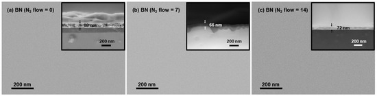Figure 7 demonstrates the SEM characterization results of three sets of BN films. Unlike TaN and TiN, BN is an insulating dielectric with poor electrical conductivity, so it is more difficult to characterize the surface and cross-section by SEM, even in the case of sputtering an ultrathin conductive layer on the surface (e.g., gold spraying). This is evidenced by the SEM test results in Figure 7, which show no visible particles on the surface, and the characterization results of the cross-section do not show any obvious film morphology. In addition, the subfigures in Figure 7a~c show the probable cross-sectional photos of the BN films. However, the thickness characterization results in Figure 7 are only the parts that we observed in our experiments that are likely to be film layers, and these results in the subfigures in Figure 7a–c do not represent the thickness of the real film layer.