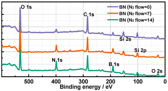 Figure 8 demonstrates the XPS test results of three sets of BN films. In the XPS spectrum of Figure 6, the binding energy corresponding to the characteristic peak of N 1s is 398.68 eV, and the binding energy corresponding to the characteristic peak of B 1s is 190.56 eV. The analyzed results in Figure 6 show that the contents of B and N in the three groups of BN thin films are relatively low, even with a N2 gas flow of 14 sccm. Specifically, the enhancement of B and N content in the film with increasing N2 flow rate can still be significantly observed, especially for the element N. The corresponding film contents of elemental N in the films at a N2 gas flow of 0 sccm, 7 sccm and 14 sccm are 4.74%, 7.68% and 10.91%, and the content of elemental B is 3.16%, 5.43% and 7.83%, respectively. This phenomenon indicates that for sputtered BN films, the N2 gas flow has little effect on the adjustment of the elemental ratio of B to N inside the films, but it can enhance the sputtering efficiency of BN films. Furthermore, the intensities of the characteristic peaks of C 1s at the binding energy of 284.17 eV and of O 1s at the binding energy of 531.22 eV are very high, which suggests the presence of very severe CO2 and water vapor adsorption on the film surface, as well as the generation of a large amount of organic contamination. In addition, the characteristic peak of Si 2p can be detected at 101.55 eV, which indicates that the quality of film formation is poor due to the XPS detection depth below 10 nanometers.