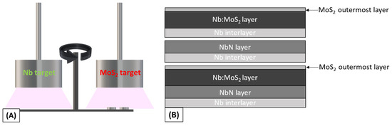 Figure 1A shows schematically the deposition system used, and Figure 1B shows the architecture of the deposited coatings. Figure 1A schematically depicts the configuration of the reactor used for depositing the Nb:MoS2 coatings. High purity (99.999 wt.%) Nb and MoS2 targets were used to avoid contamination of the deposited films by other elements. The power applied to the Nb target was changed, while the power applied to the MoS2 target was maintained constant. Changing the applied power to the Nb target made it possible to change the stoichiometry of the coating, as it will be later demonstrated. The specimens were placed on a 100 mm round table rotating at a speed of 18.5 rpm. Table 1 shows the geometric and deposition parameters of the process.