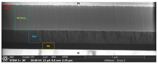It is important to mention that Figure 5 indicates the presence of Nb at the region corresponding to the FIB Pt protecting layer. This result is explained by the similar radiation these elements present, misleading the EDS technique. The indication of Mo and S in the NbN layer is due to the superimposition of Mo Lα and Lβ with the Nb Lα and Lβ and S Kα and Kβ radiation energies. During the window integration for creating the EDX maps, when the energy difference is less than 140 eV (resolution of the detector), the peaks overlap. This explains the presence of a small fraction of Mo and S or Pt signal in NbN EDX maps.