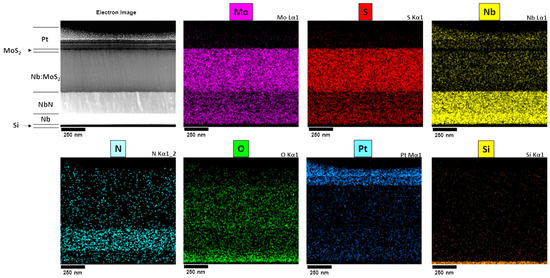 Figure 5 shows the Mo, S, and Nb concentration maps across the multilayer film. It is worth noting the NbN reinforcing interlayer beneath the Nb:MoS2 layer.