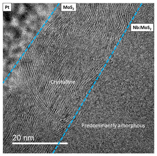It is interesting to observe that pure MoS2 presents a crystalline character and a lamellar structure composed of alternating S-rich and Mo-rich layers [41,42]. On the other hand, the Nb:MoS2 layer beneath the outermost MoS2 coating is amorphous, indicating that doping the MoS2 film with Nb amorphized the film.